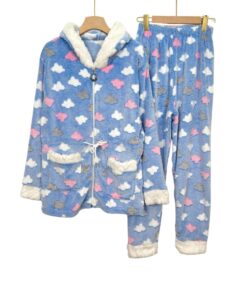 A super-soft women’s mohair pyjama set with a cozy zipper hoodie and matching pants. Designed with a cute cloud pattern for a warm and relaxed winter feel. The inner lining is extra fluffy for maximum comfort. Perfect for chilly nights and home relaxation.