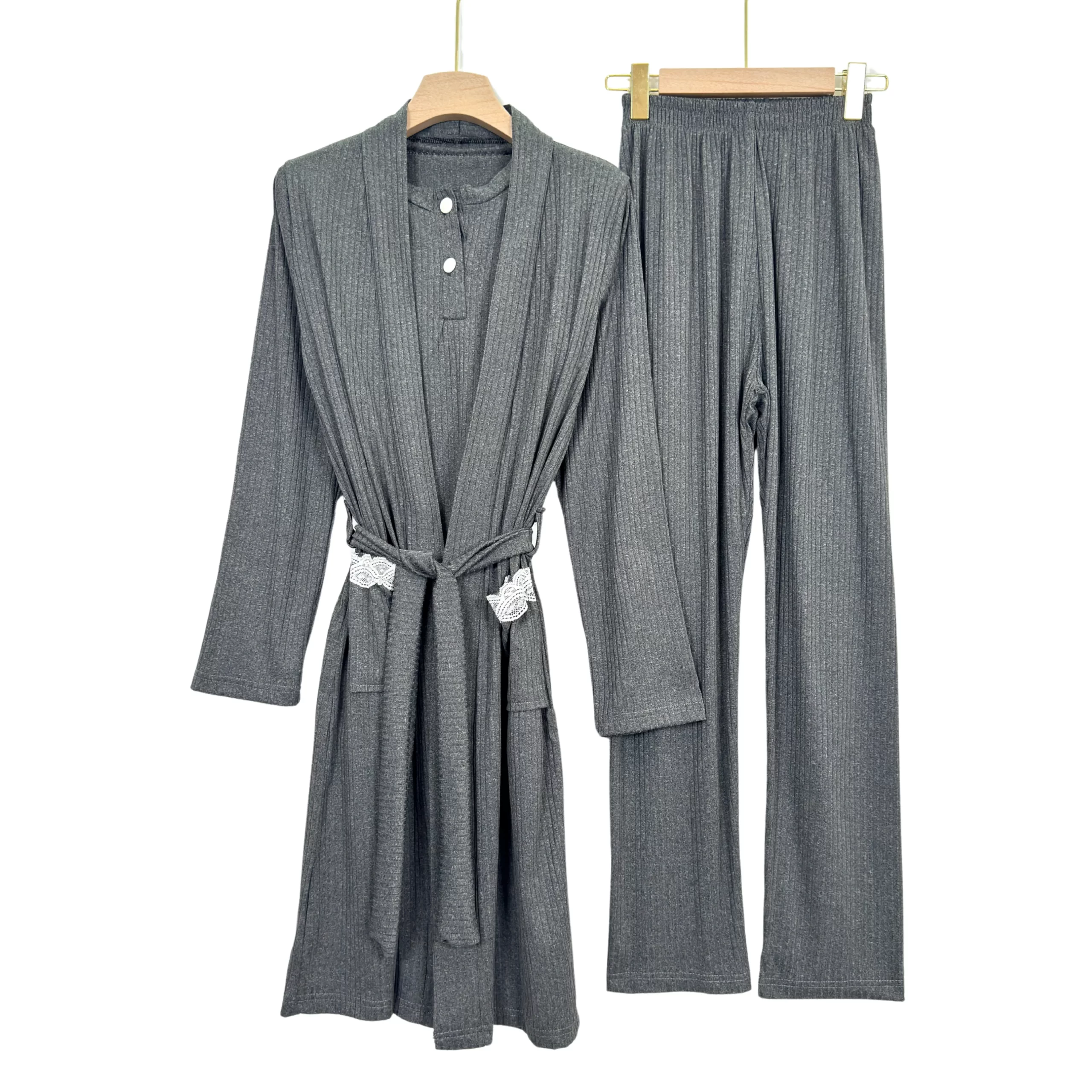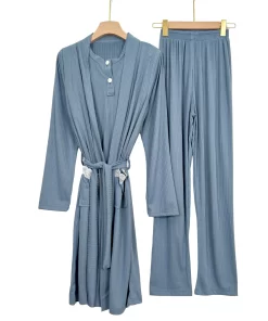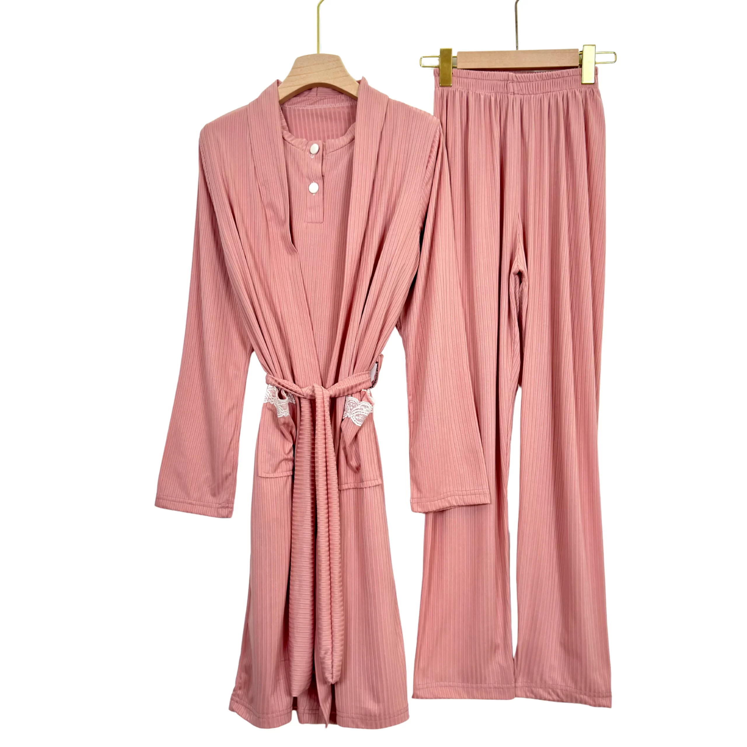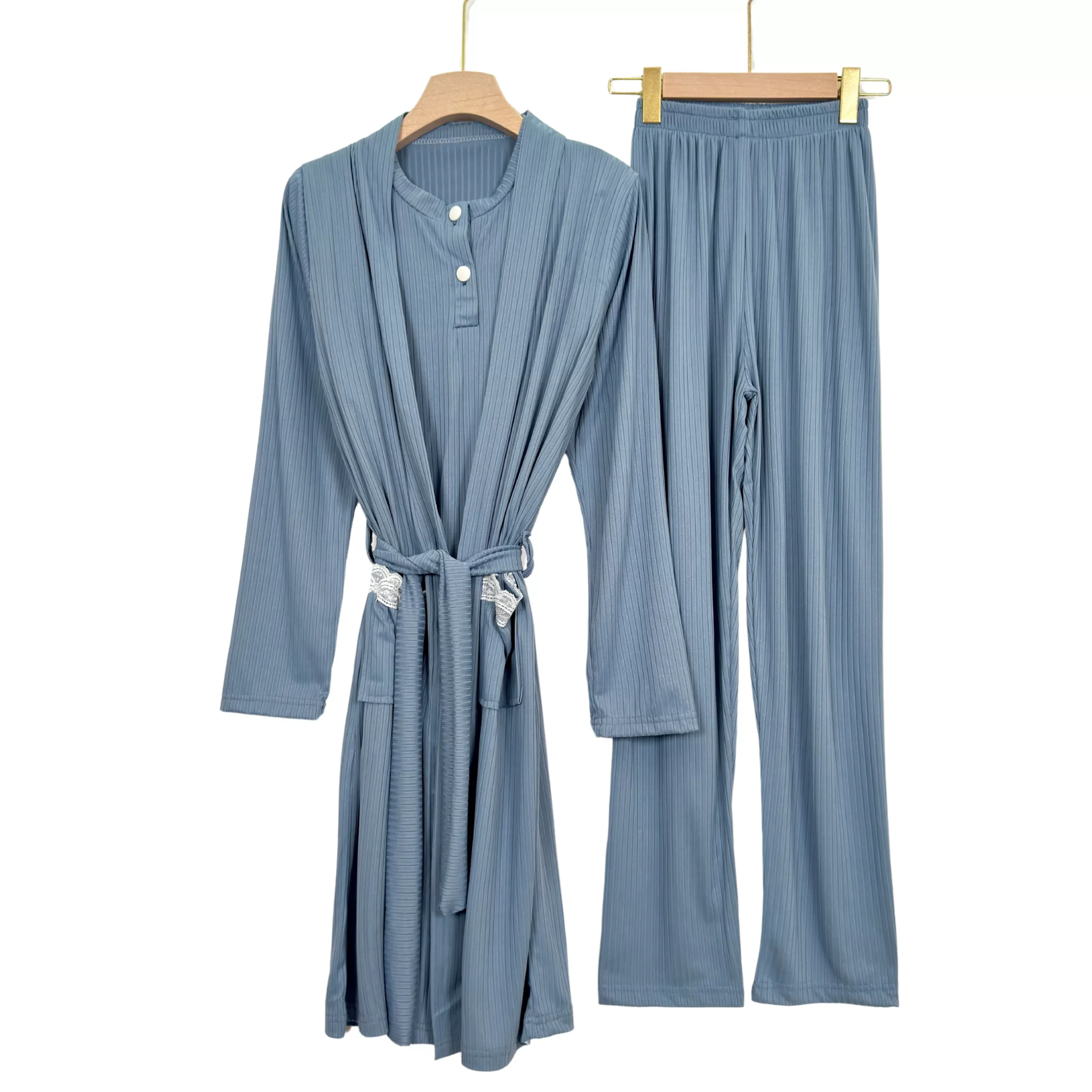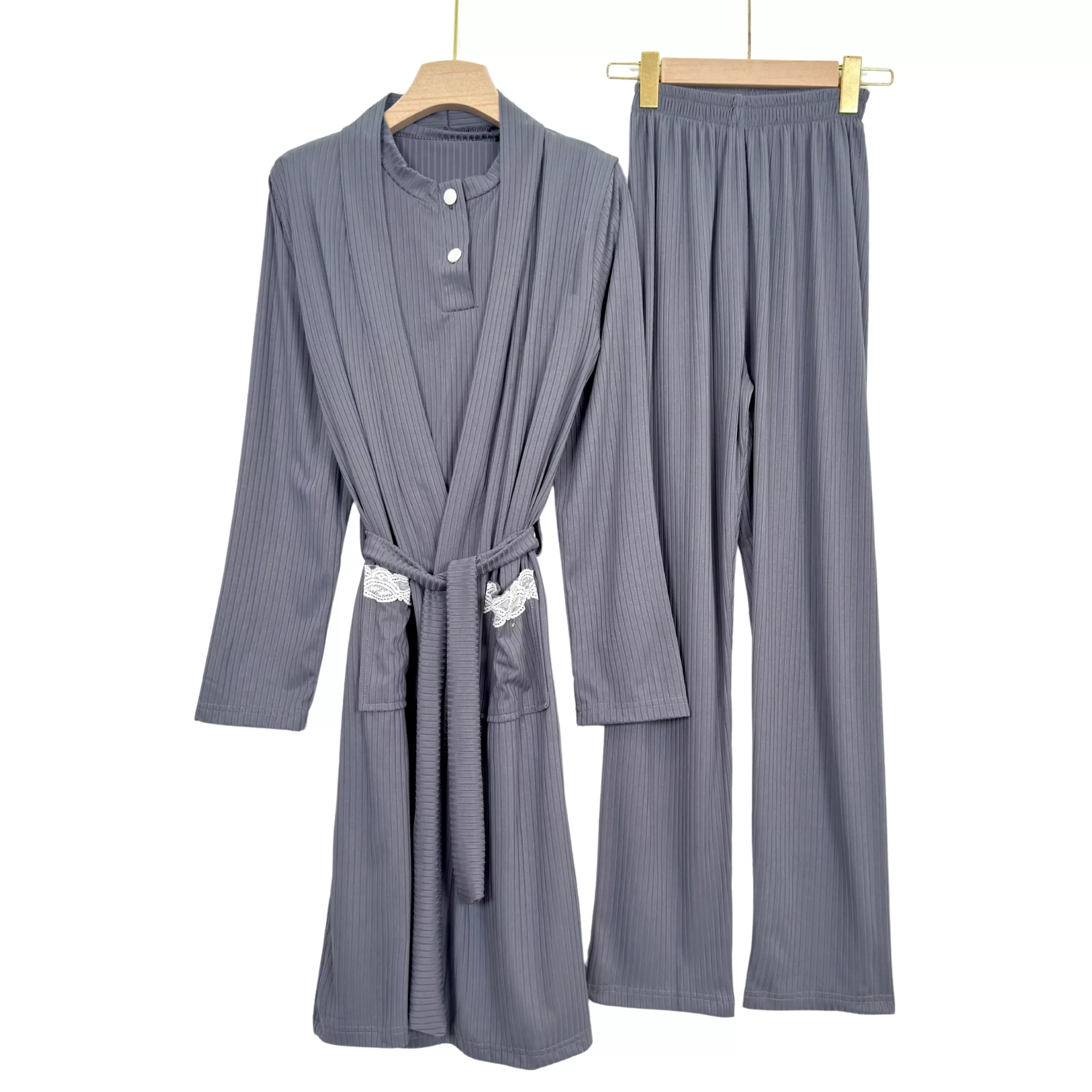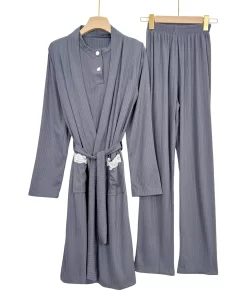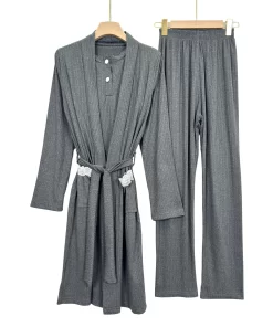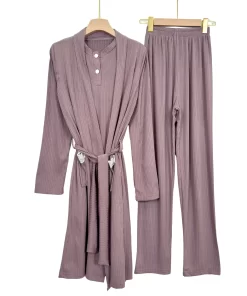 “Elegant ribbed summer pajama set with short sleeves and matching robe – soft, breathable, and perfect for warm nights.”