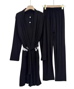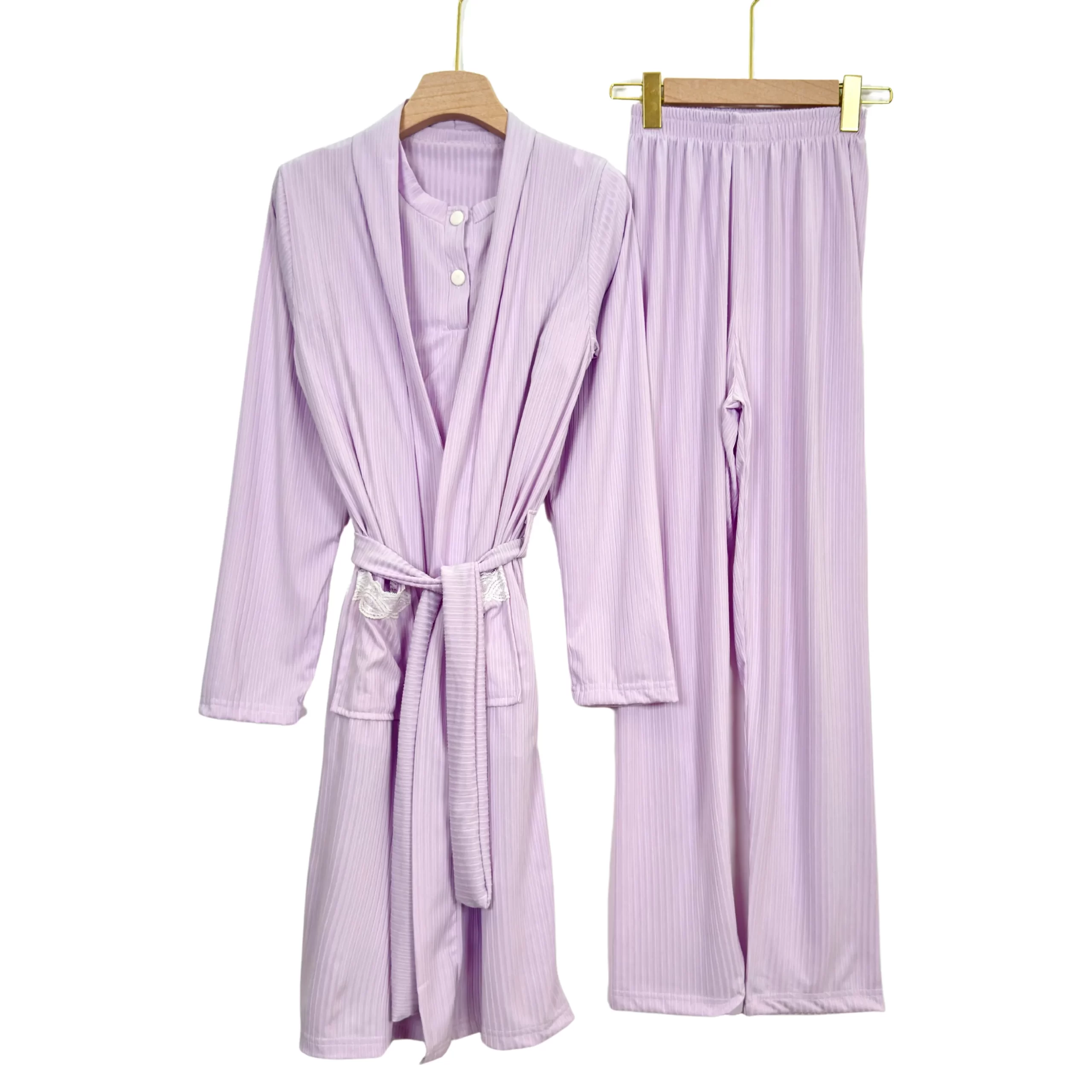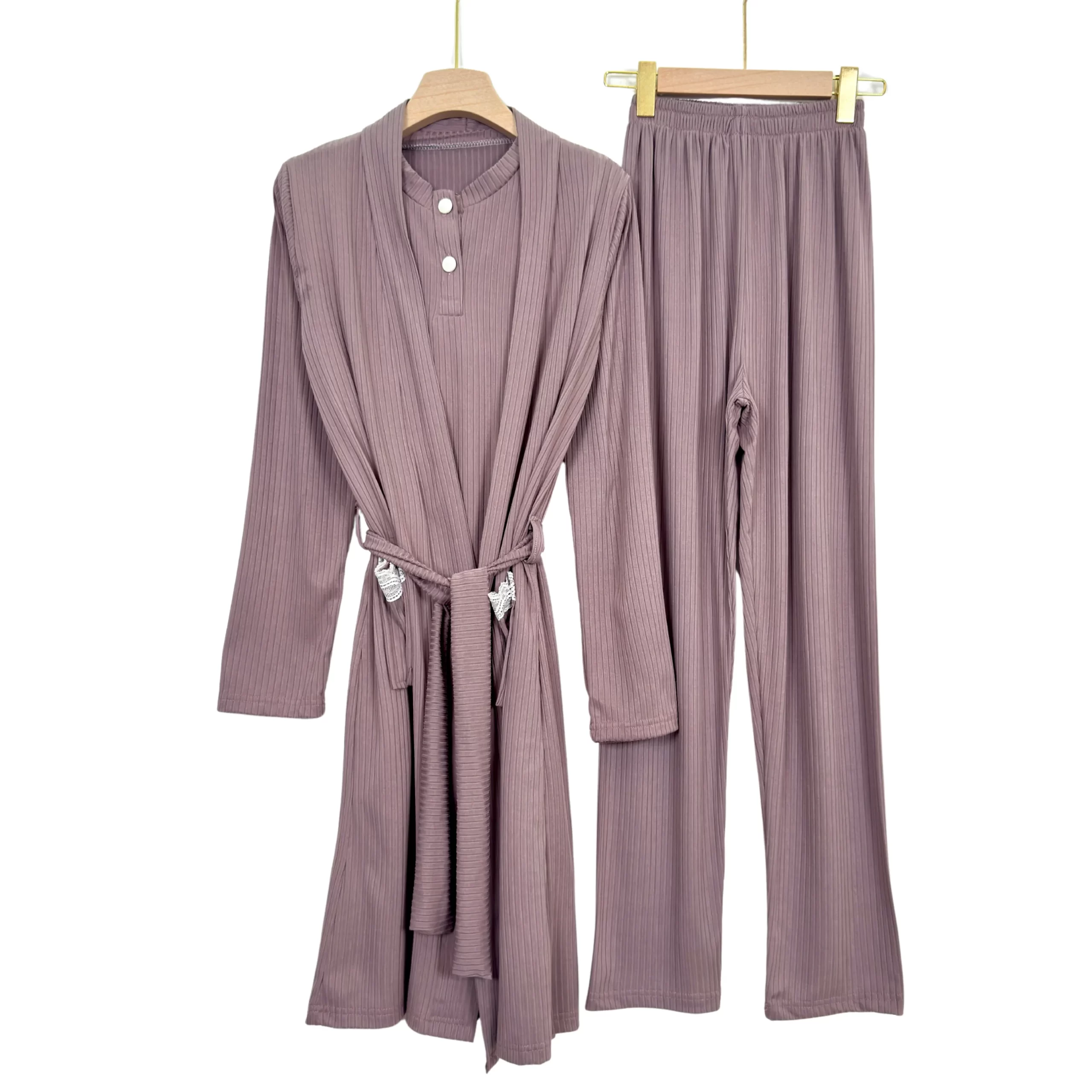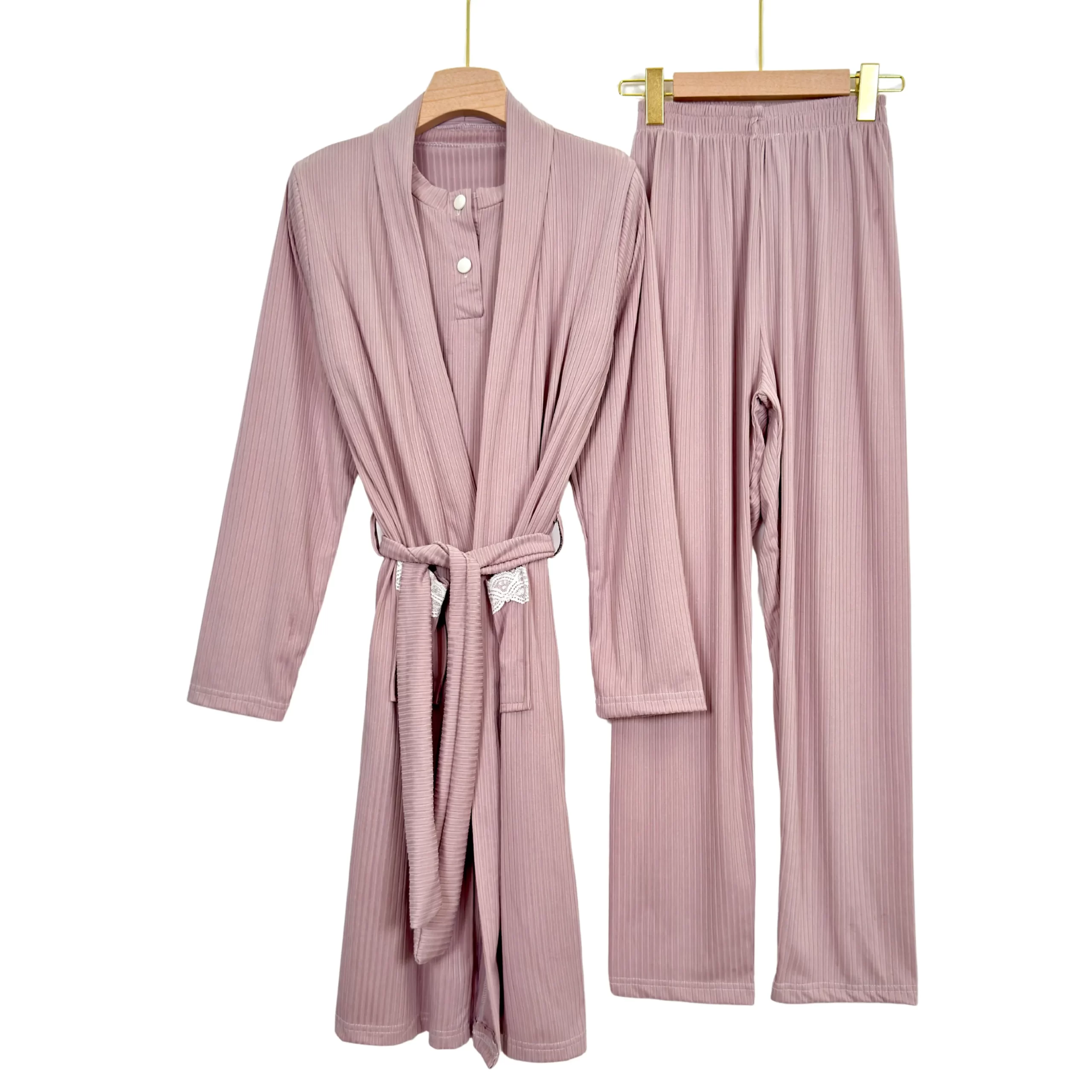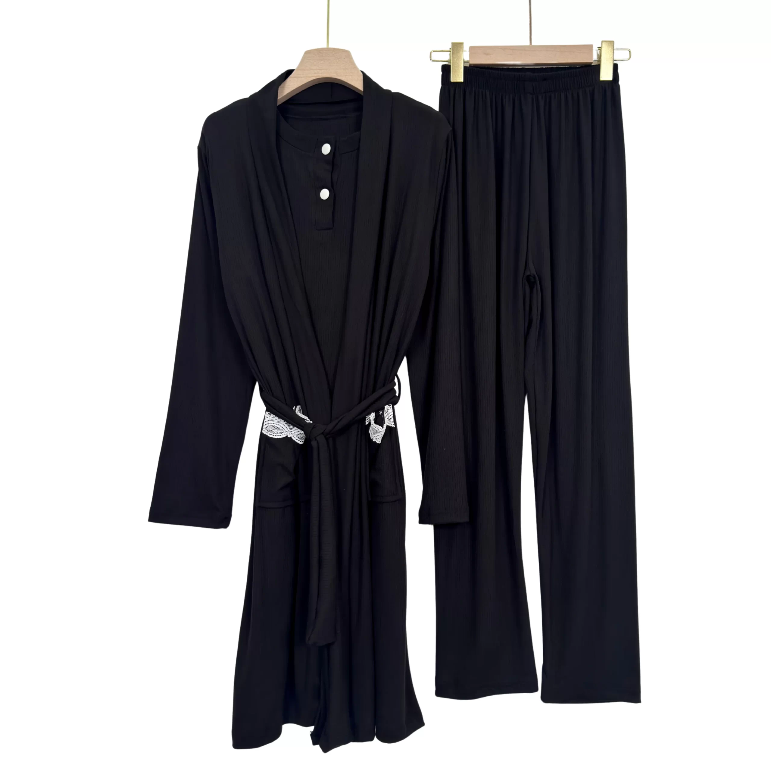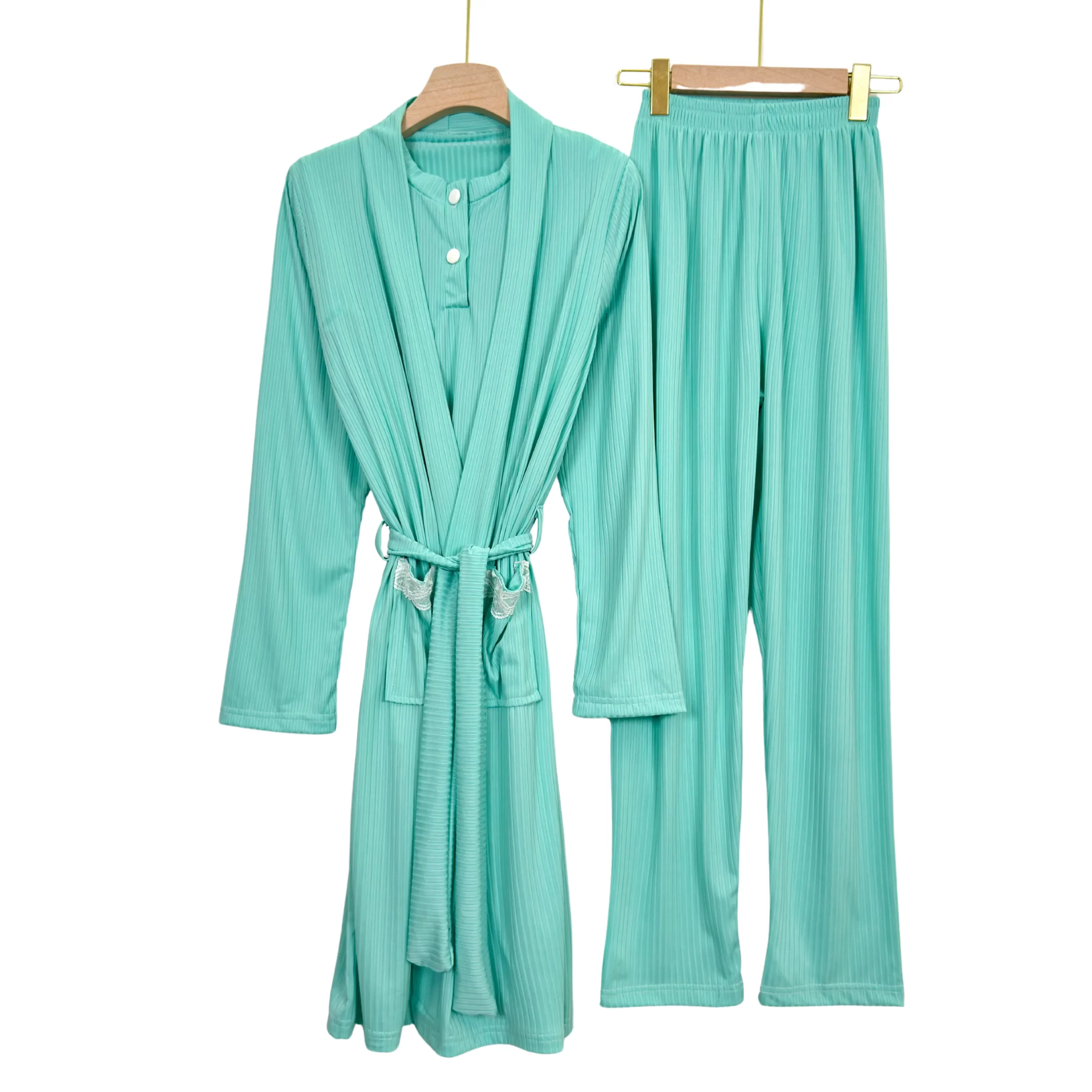 “Elegant ribbed summer pajama set with short sleeves and matching robe – soft, breathable, and perfect for warm nights.”
