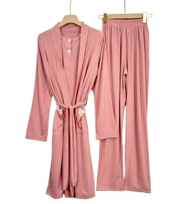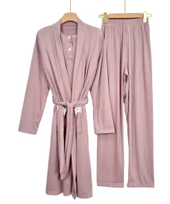 Ribbed Summer Women’s Pajama Set with Robe – Short Sleeve