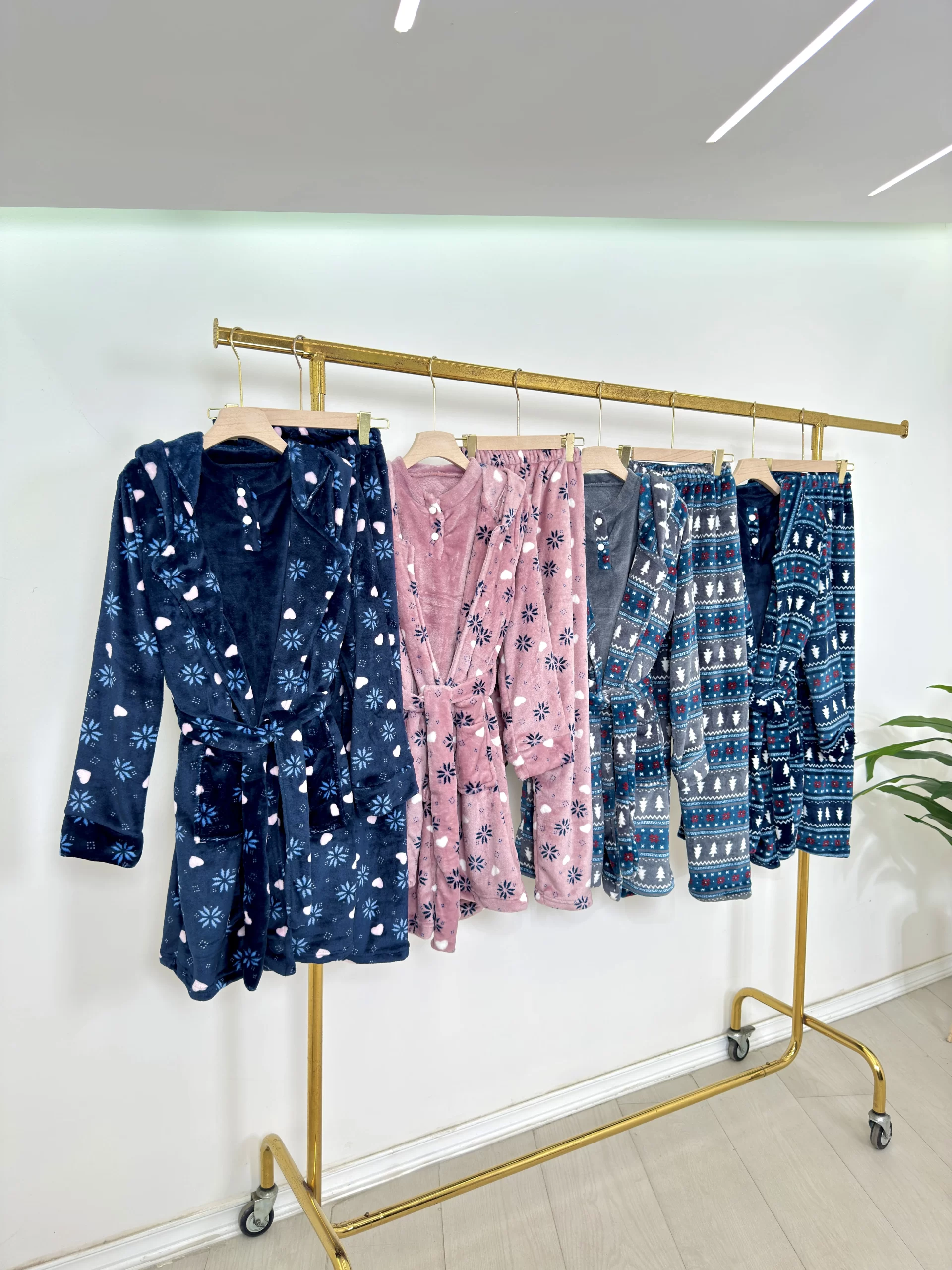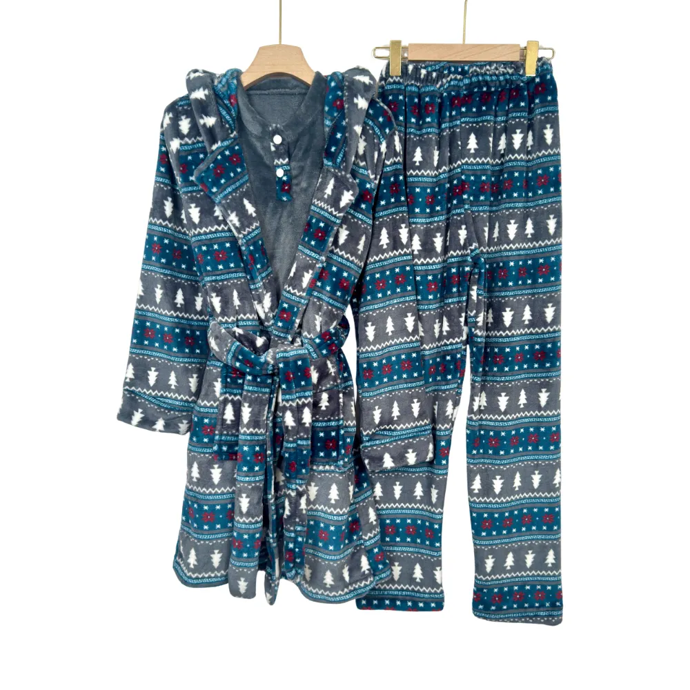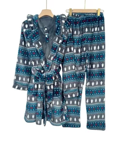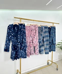 • Includes a warm printed robe, a soft top with white and pink heart pattern, and matching grey plush pants,