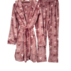 The set features a buttoned long-sleeve top, matching pants, and a warm robe with a tie belt.