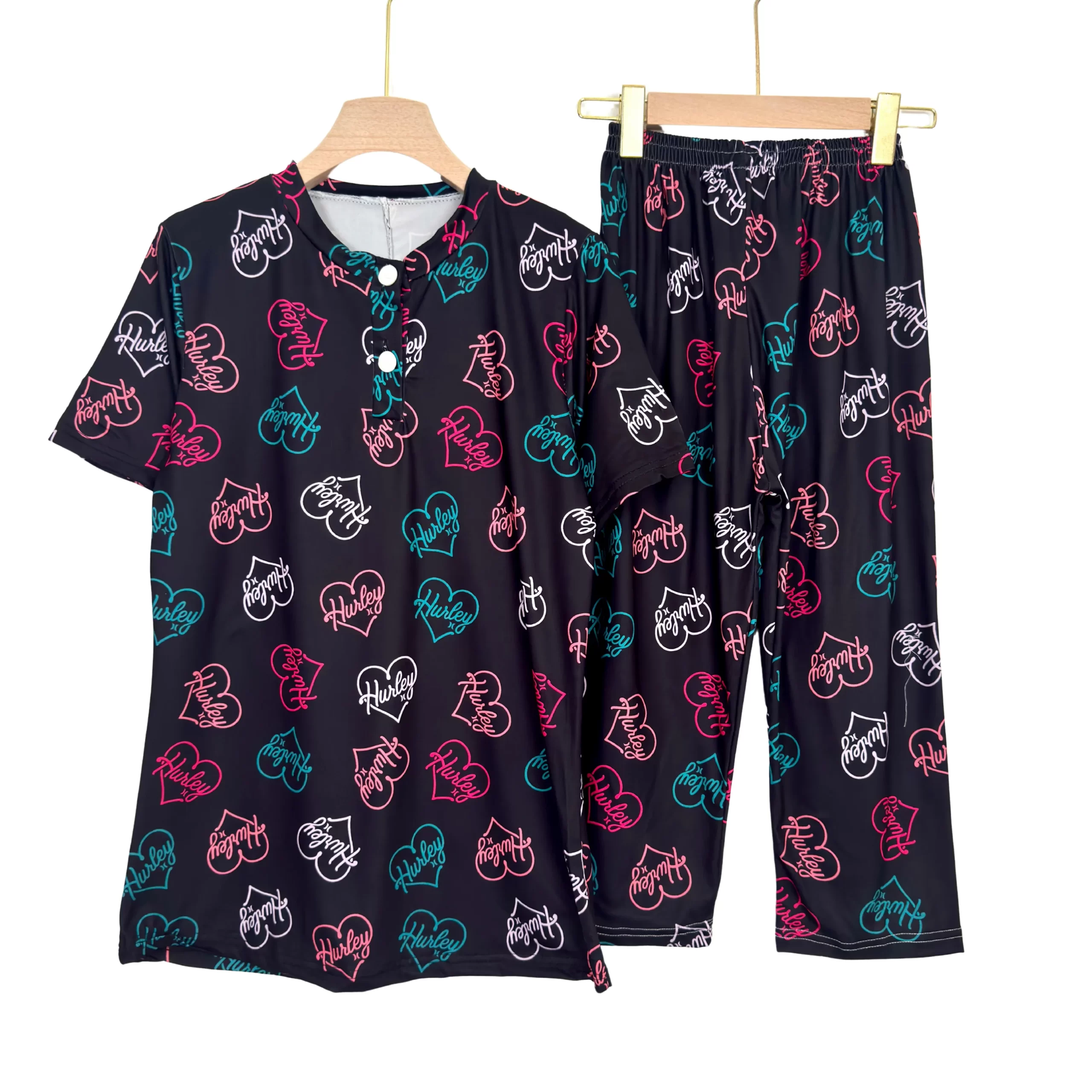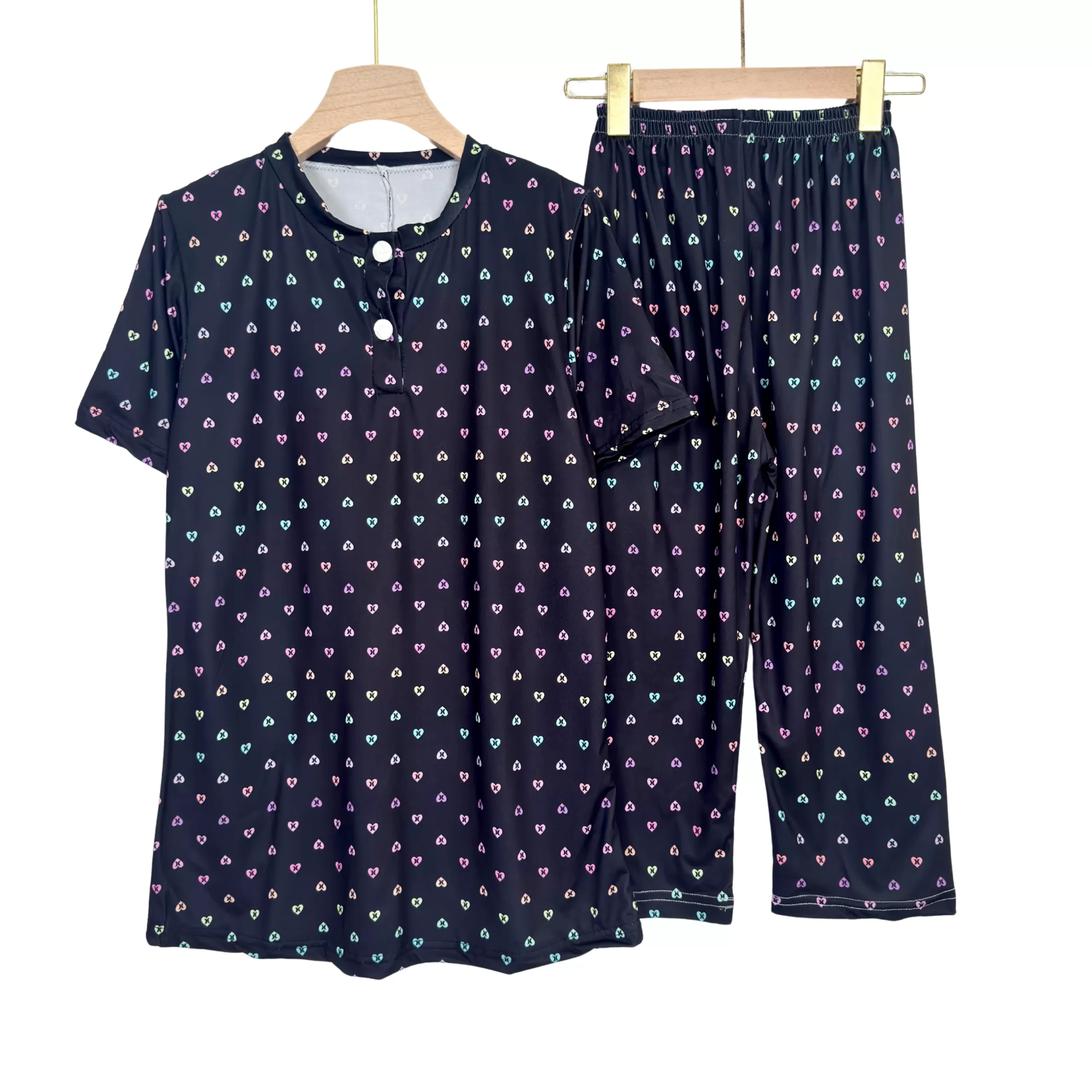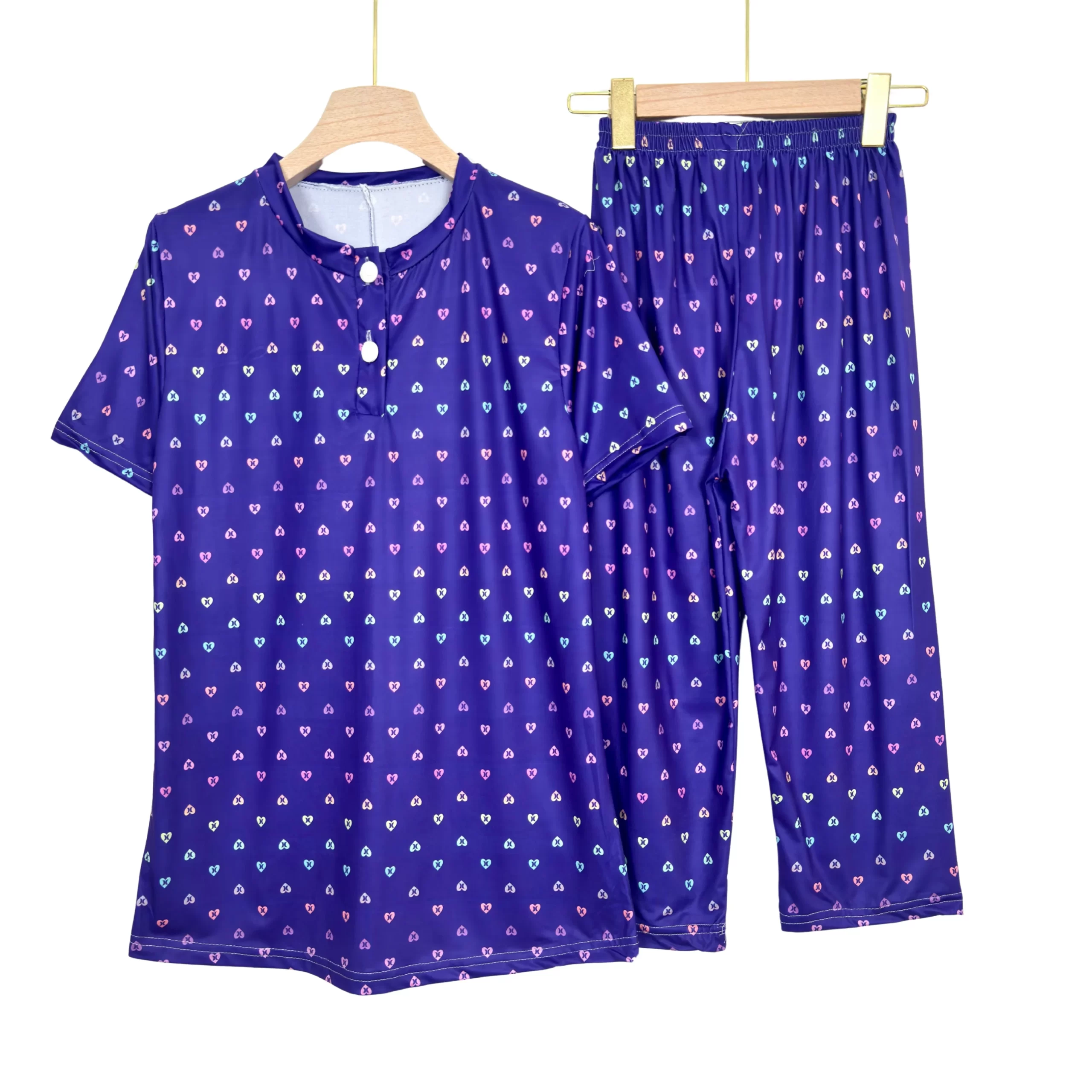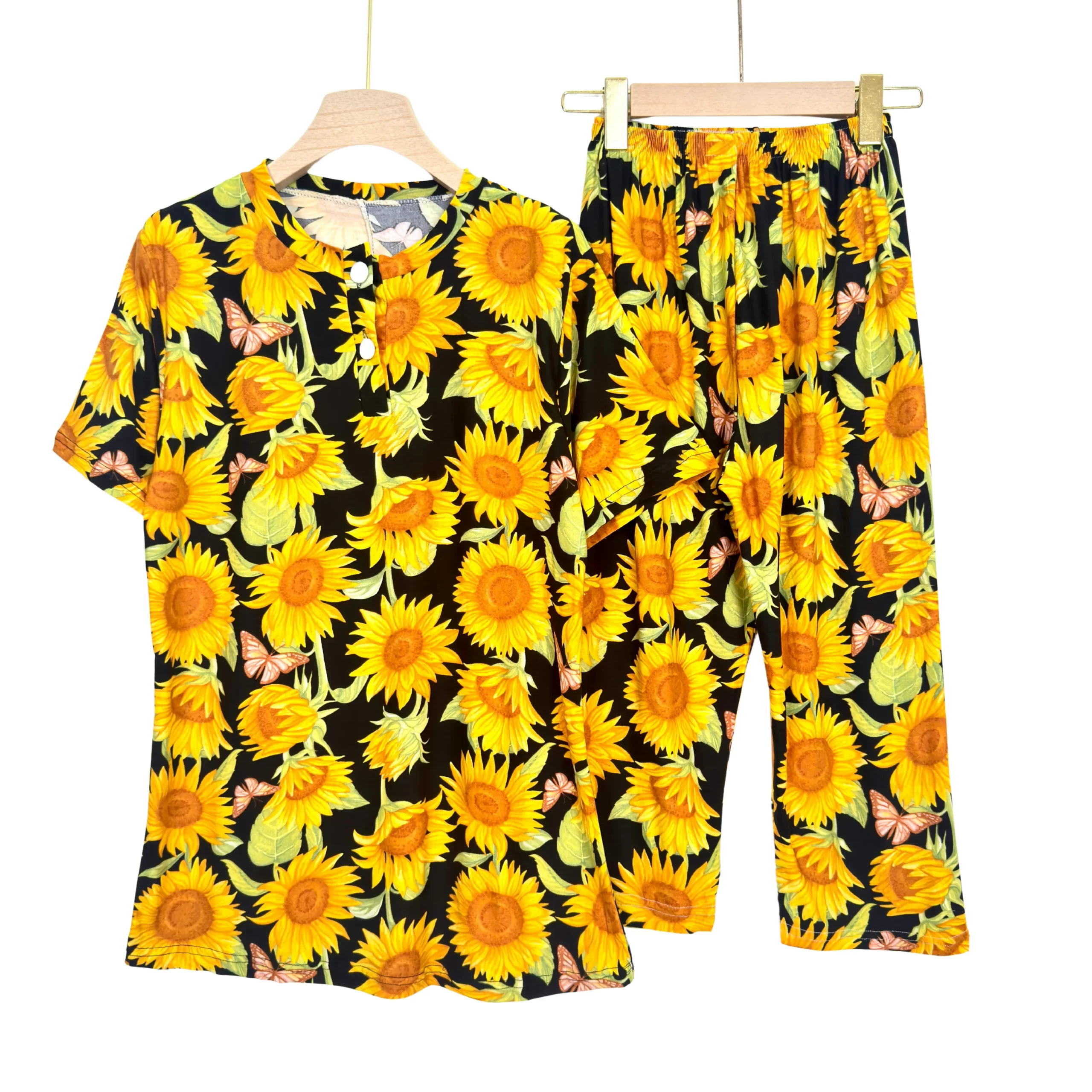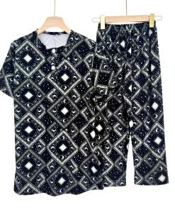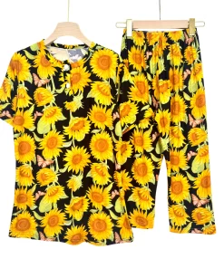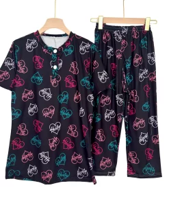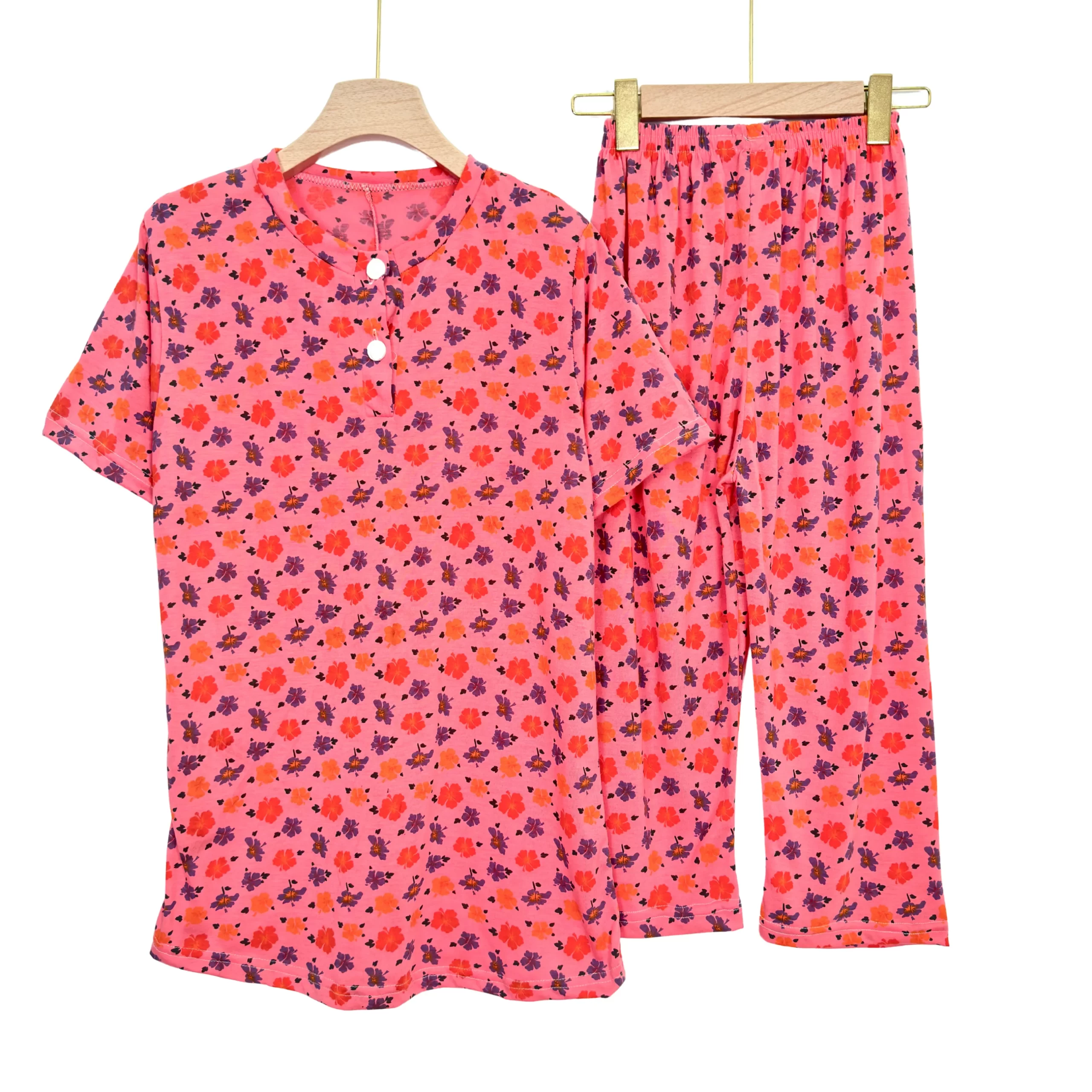 Women’s cotton summer pajama set with floral print, buttoned top & comfy capri pants – ideal for lounging or sleep.