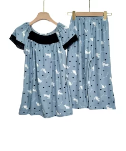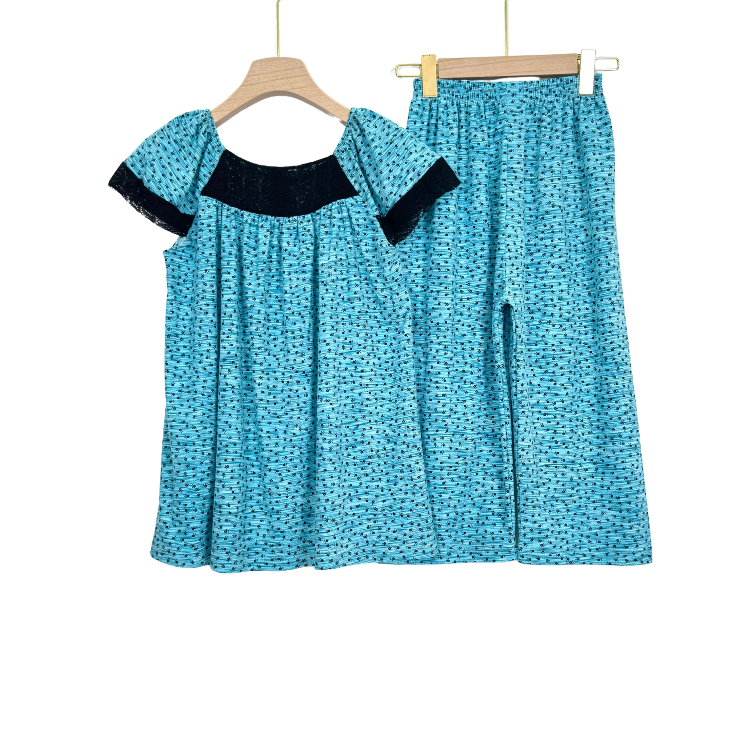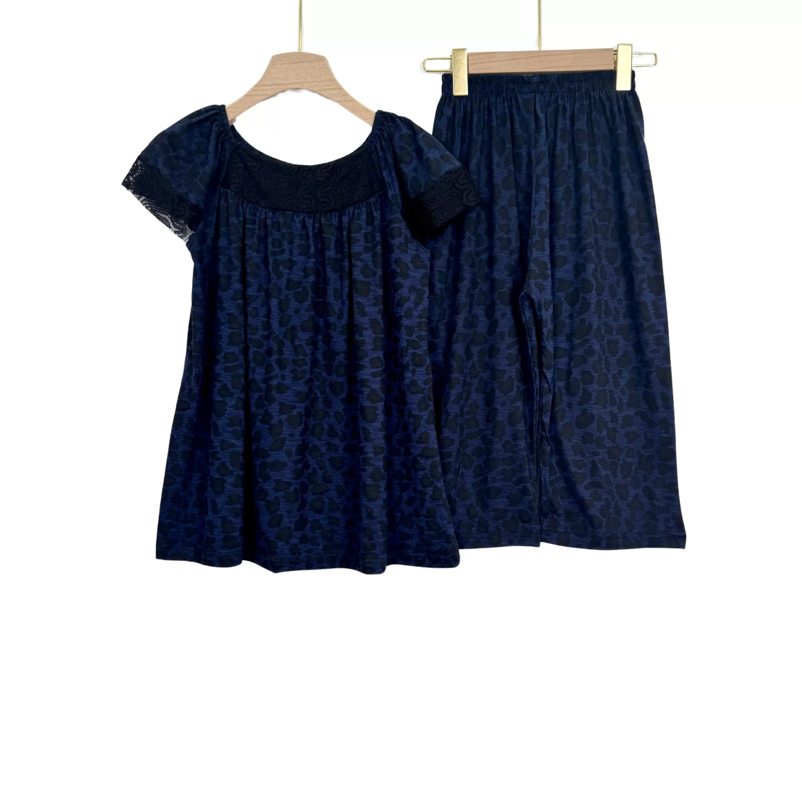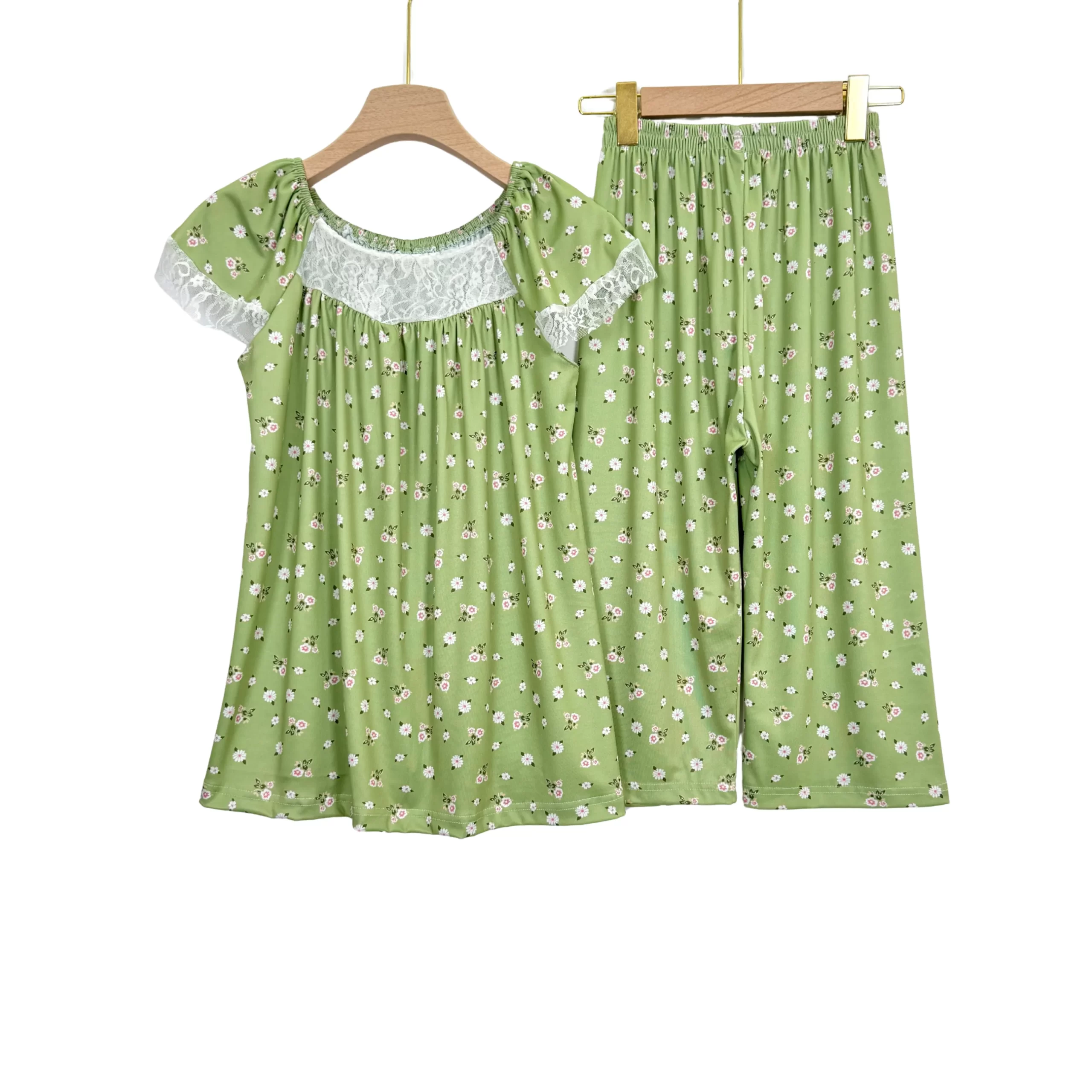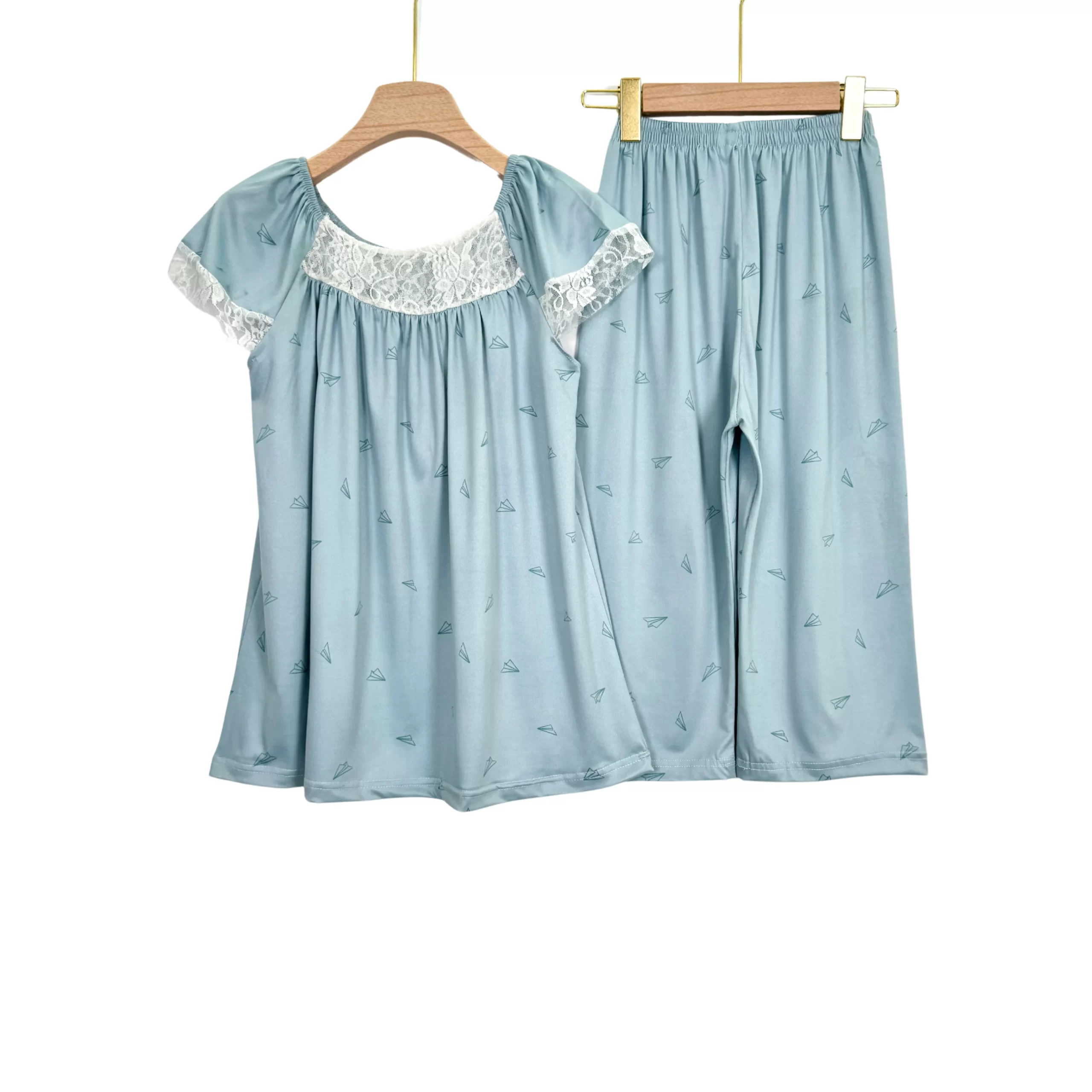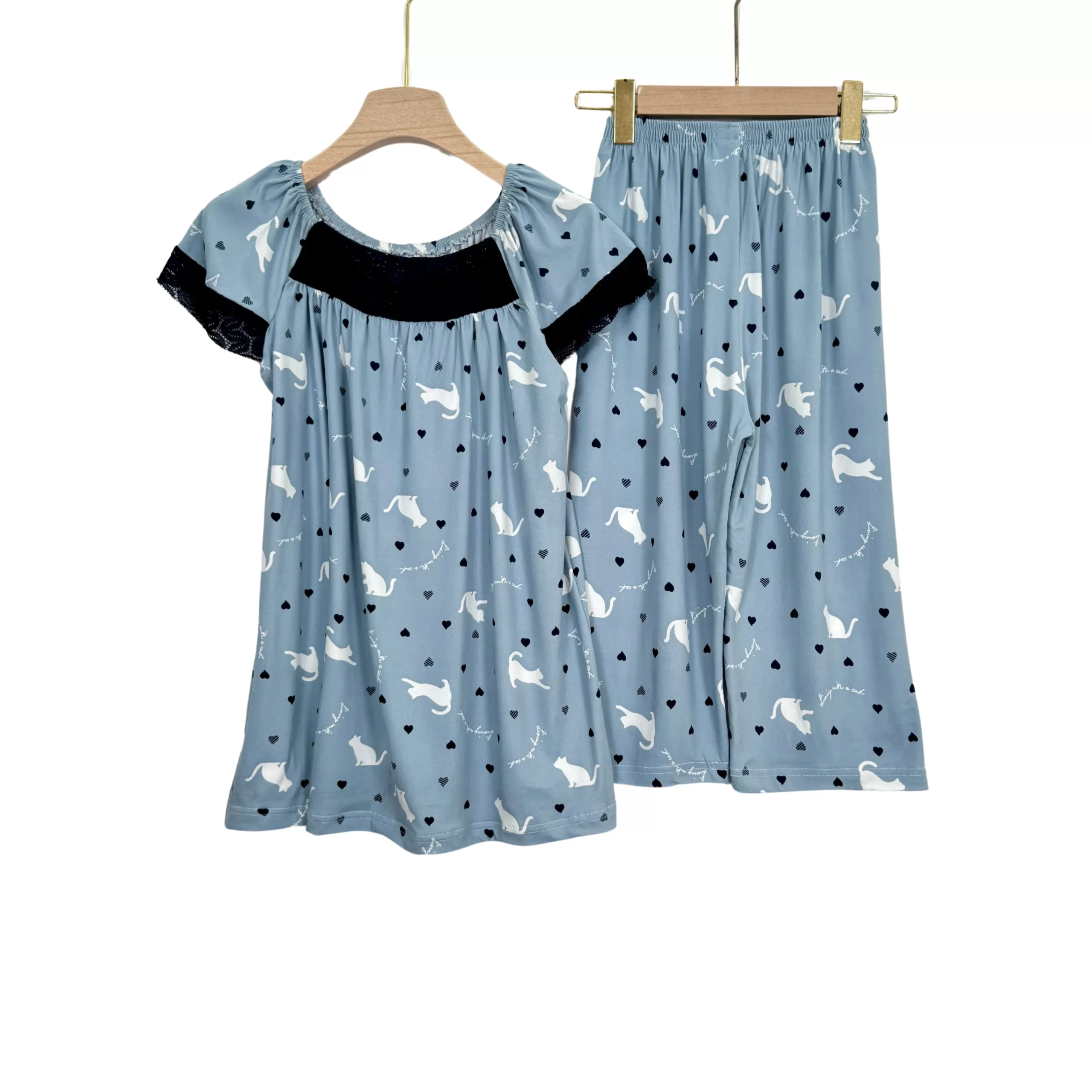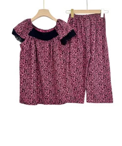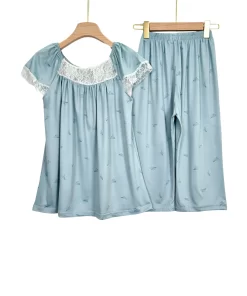 Women’s Summer Cotton Pajama Set with Lace – Short Sleeve Top & Capri Pants