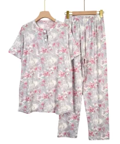 Features a stylish buttoned top and full-length pants for easy lounging.