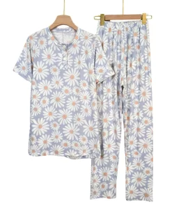 Features a stylish buttoned top and full-length pants for easy lounging.